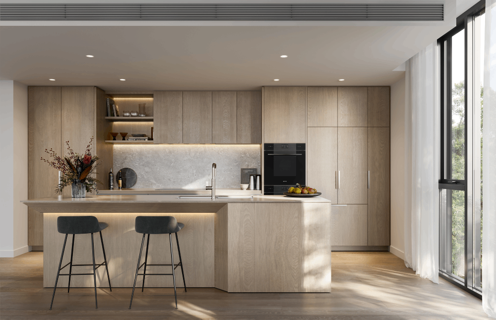 Nestled within the leafy canopy, Highforest apartments offer a bird’s eye view to the forest, a unique sense of treehouse living and an intimate connection to nature. Premium finishes reflect the tones and textures of nature, lending serene sophistication to luxurious contemporary apartments that offer diversity and flexibility to suit all lifestyles, with a focus on family-centric living centered around the kitchen.